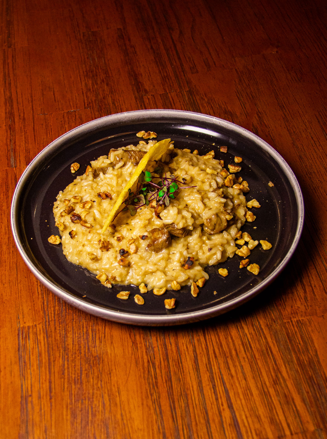 Risotto com tiras de mignon, queijo parmesão, queijo gorgonzola e nozes tostadas.