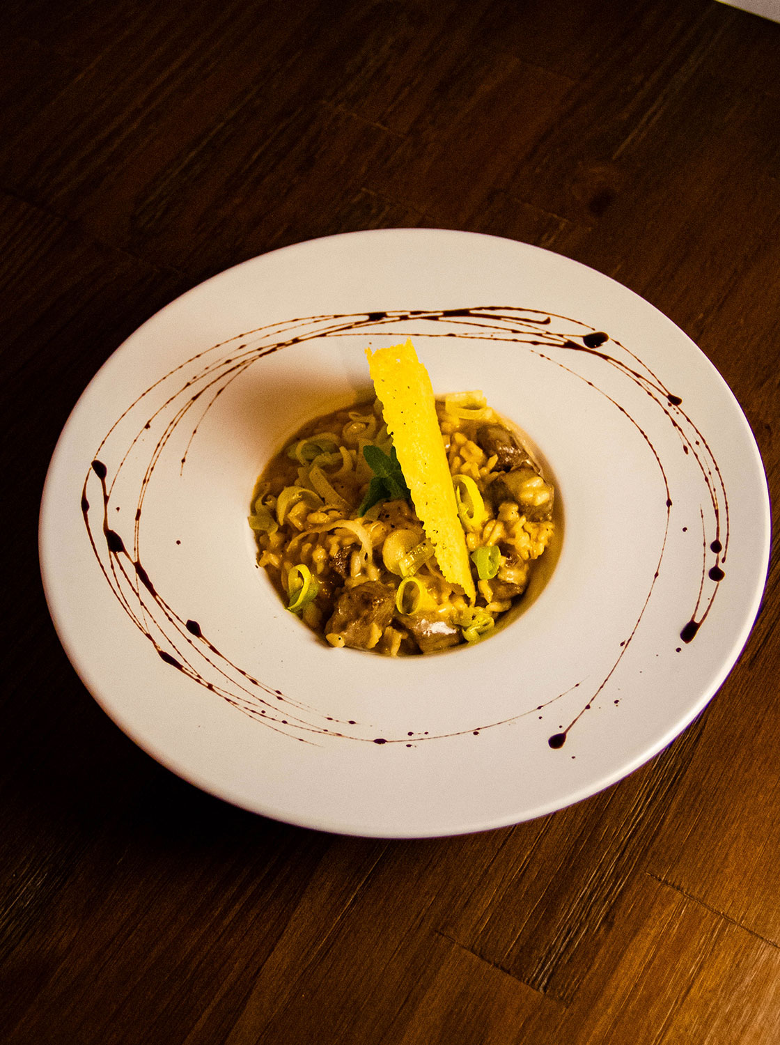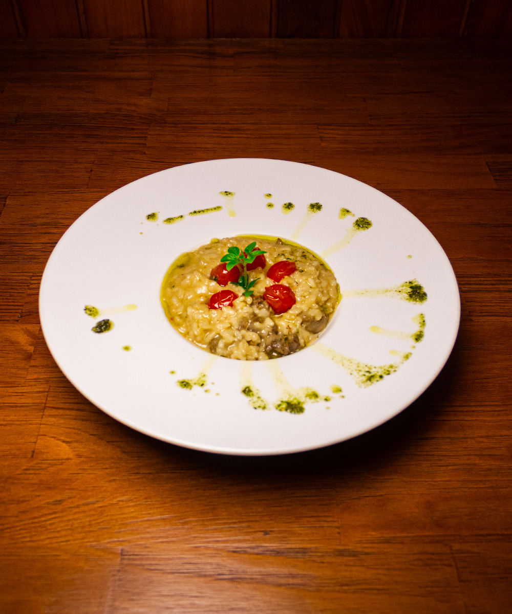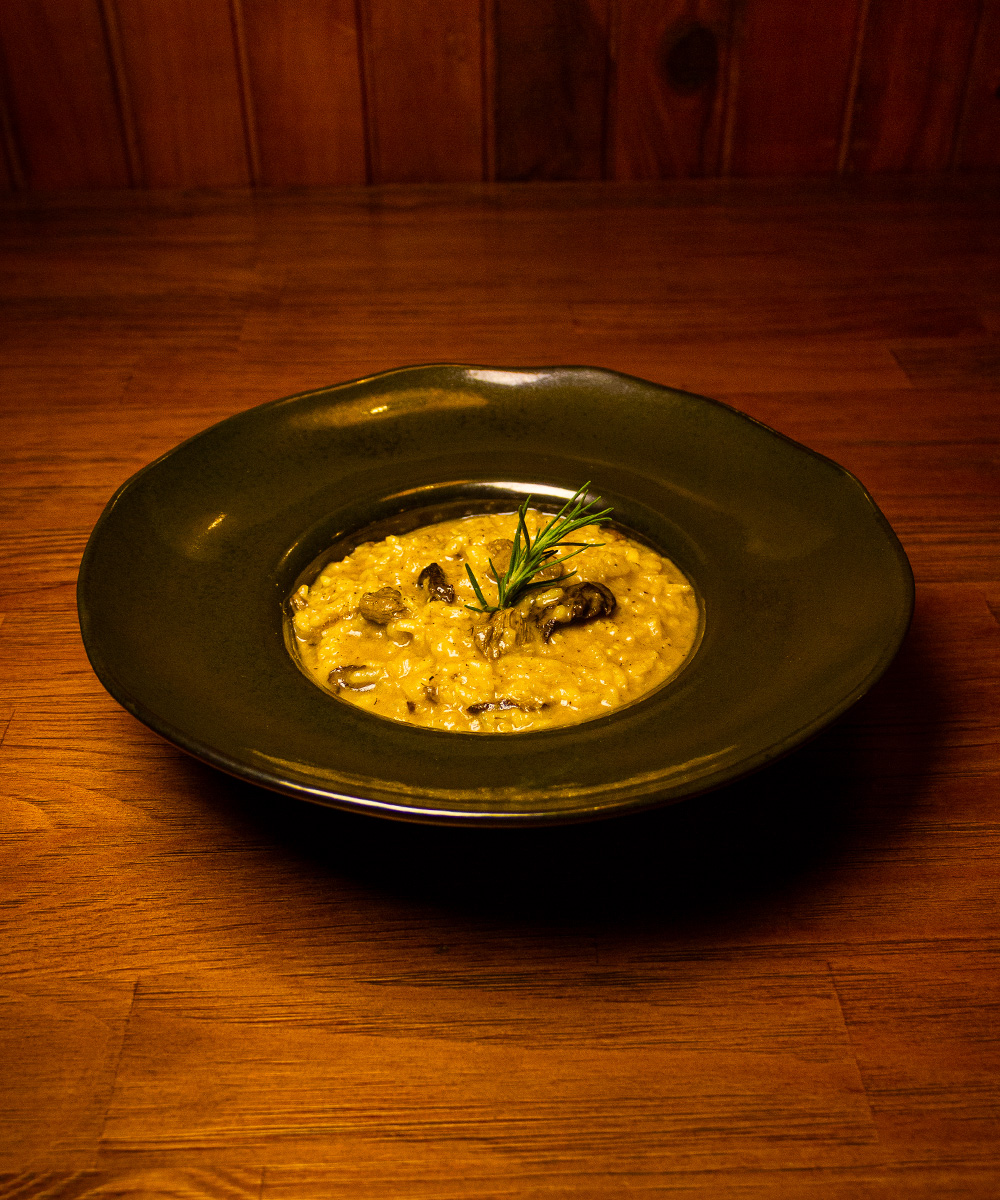 Risotto com tiras de mignon, cogumelos salteados e queijo parmesão.