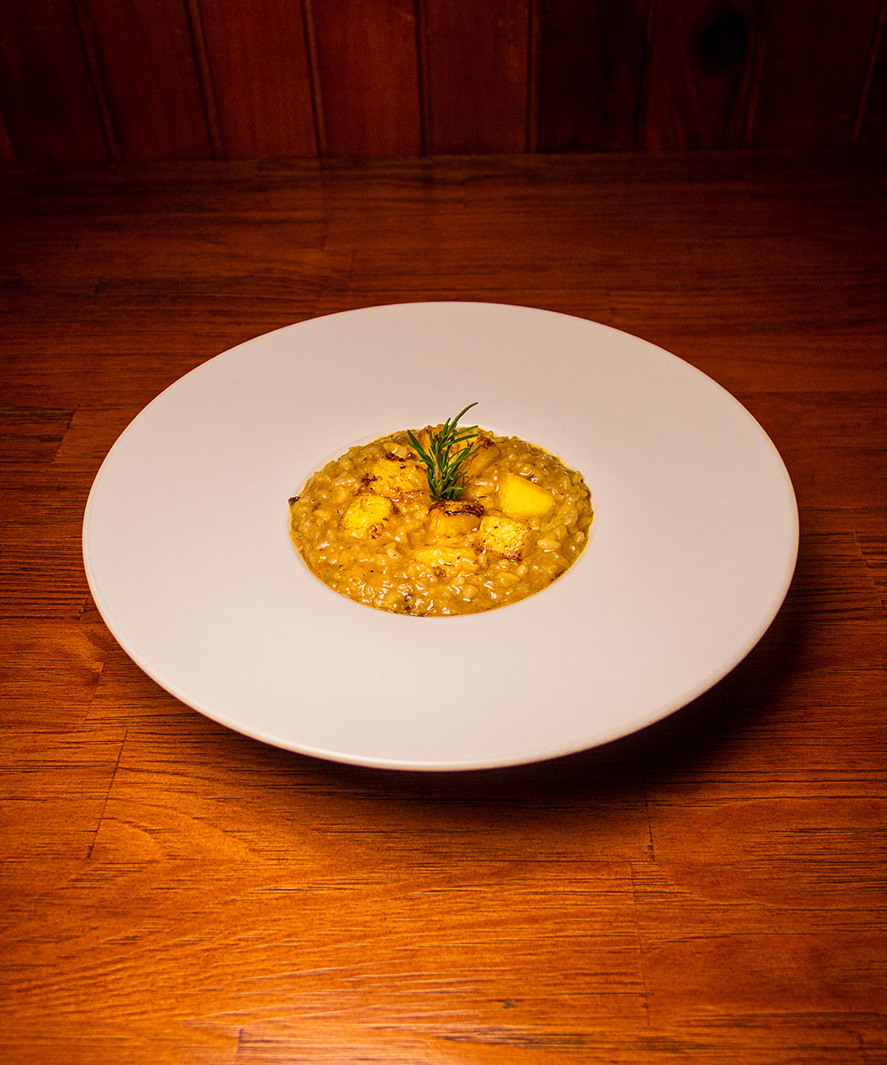 Risotto com pedaços de pernil suíno, abacaxi caramelizado e queijo parmesão.