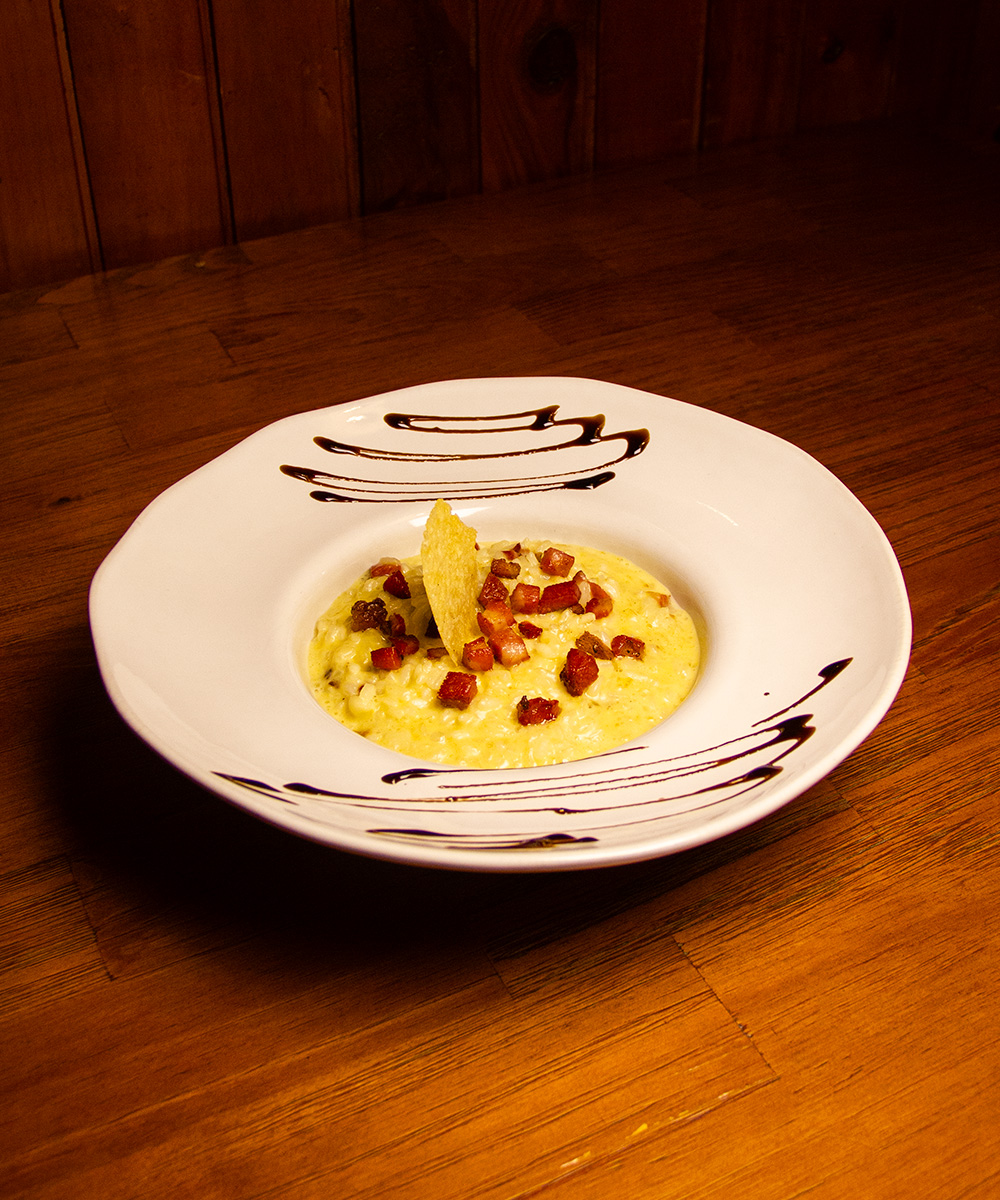Risotto com cubos de bacon e creme carbonara (ovos e queijo parmesão).