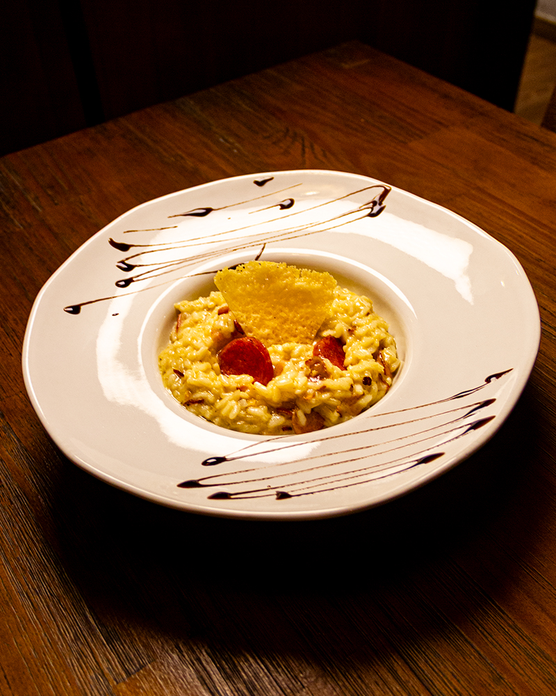 Risotto com linguiça blumenauense, bacon e queijo parmesão.